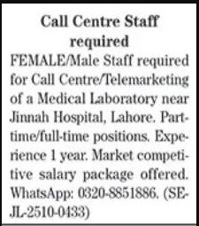 Call Centre Jobs in Lahore 2025 | Medical Laboratory Call Centre Vacancies Near Jinnah Hospital