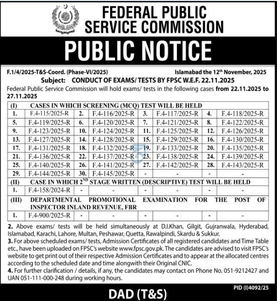FPSC Public Notice Jobs 2025 – Screening Test Schedule Announced | Apply Now for FPSC Public Notice Jobs